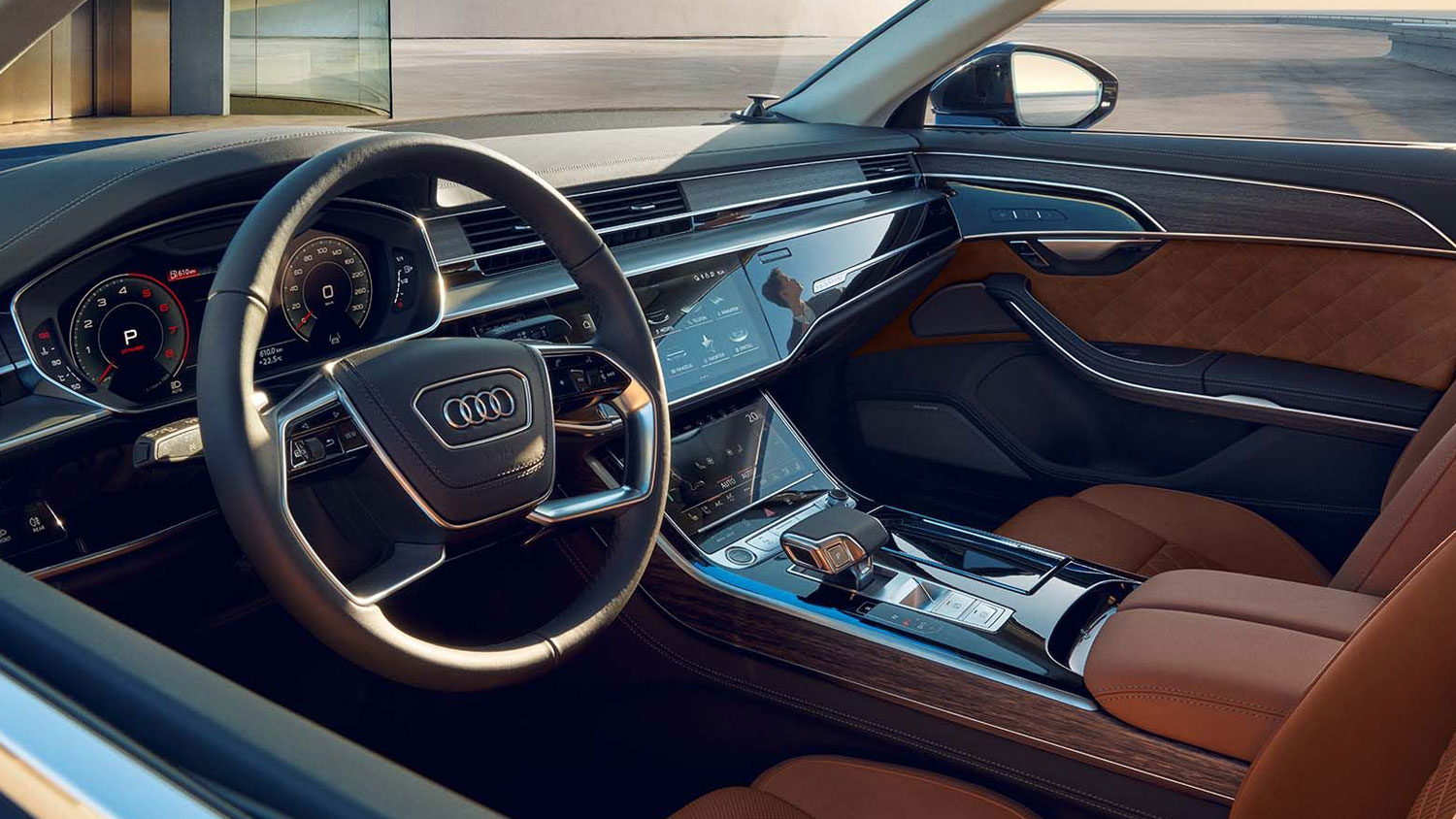 Tận hưởng một không gian nội thất cực kỳ rộng rãi và thoải mái với vị trí ngồi đặc biệt phía sau. Nội thất của A8 L như một phòng chờ rộng rãi, được thiết kế riêng biệt mang đến một trải nghiệm không gian mở và thư thái kết hợp với kiến trúc tập trung vào chiều ngang làm tô thêm điểm nhấn về chiều rộng của xe.