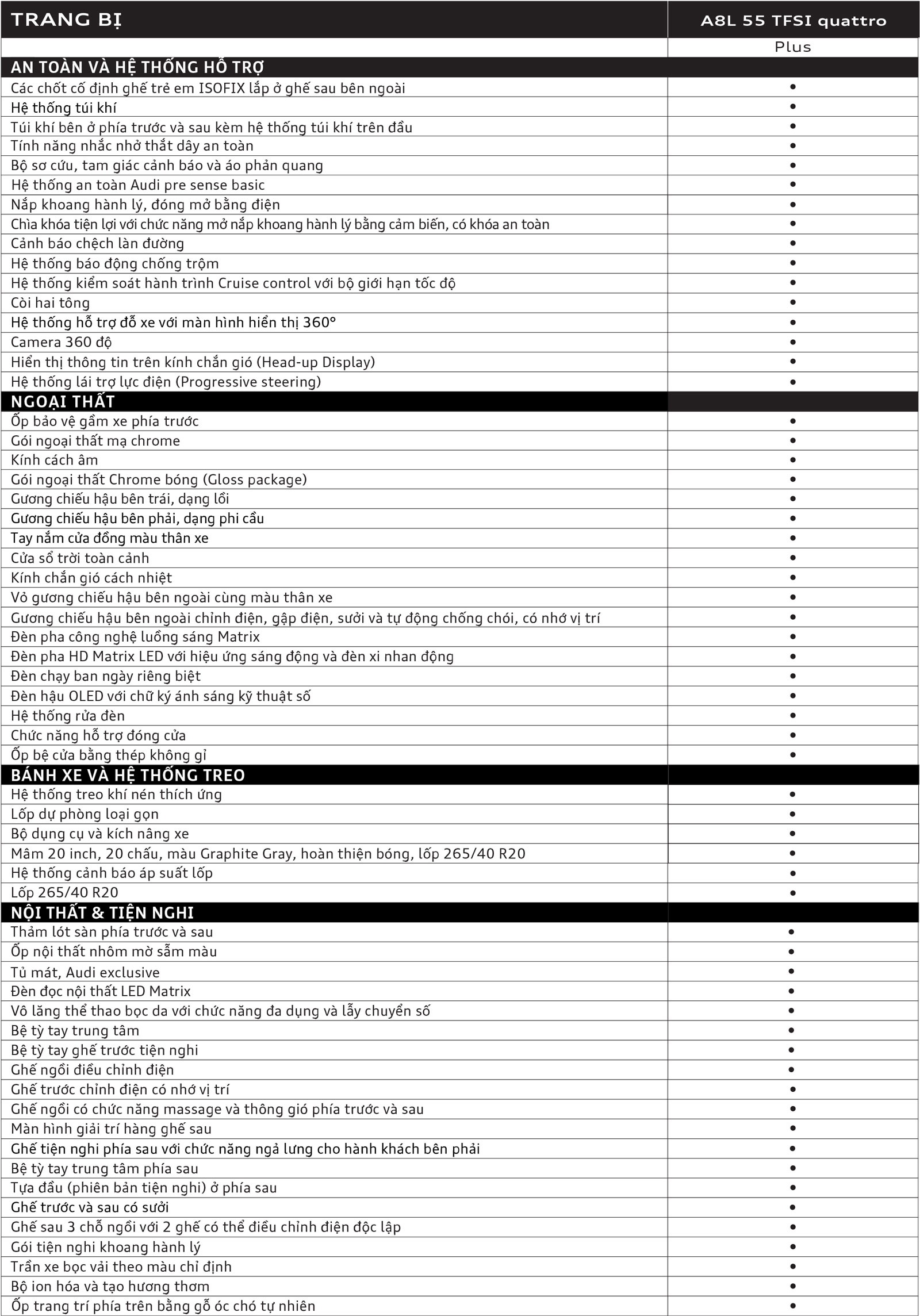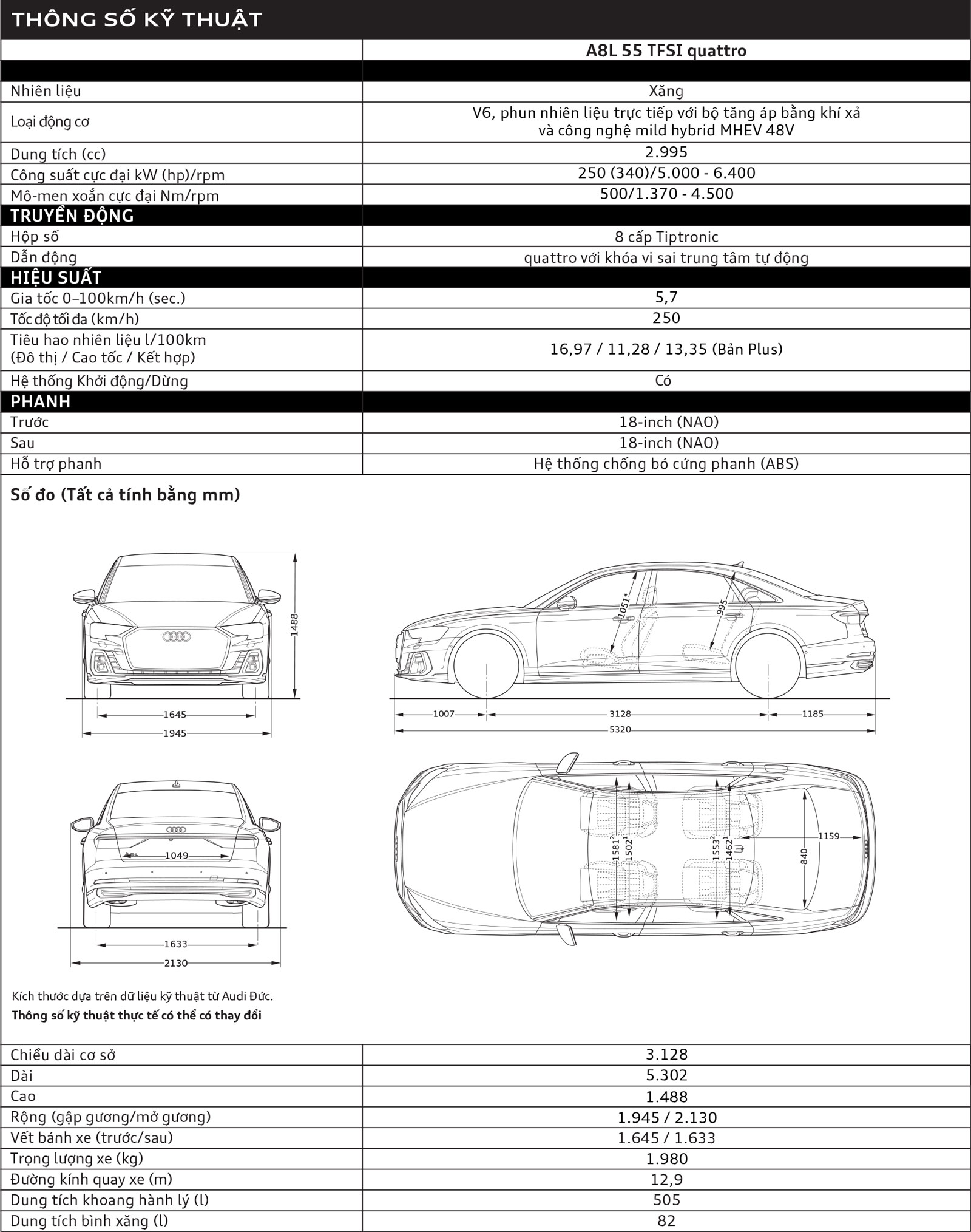 Audi A8 L 55 TFSI quattro sử dụng động cơ xăng 3.0 TFSI với công suất lên tới 250 kW (340 mã lực), đạt mô-men xoắn 500 Nm trong dải vòng tua từ 1.370 tới 4.500 vòng / phút, tăng tốc từ 0 tới 100 km/h chỉ trong 5,7 giây. Tại Việt Nam, Audi A8 L hiện có 3 phiên bản: Classic, Plus và Premium. Mức tiêu thụ nhiên liệu và phát thải CO₂ sẽ phụ thuộc vào mâm / lốp mà xe sử dụng.