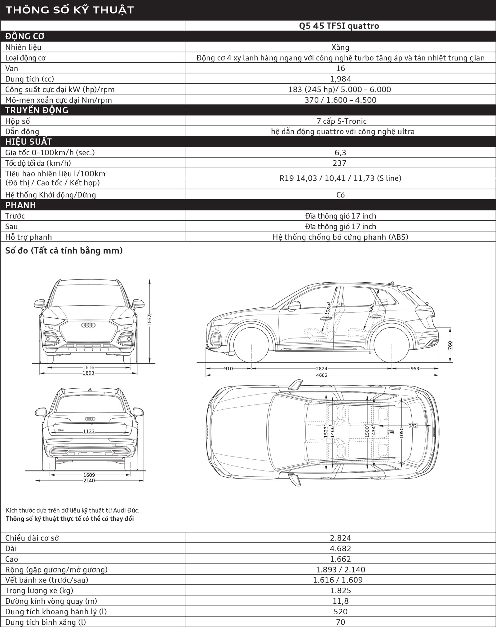Động cơ xăng 2.0 lít của Audi Q5 45 TFSI quattro tạo ra công suất 183kW và mô-men xoắn 370Nm, tăng tốc từ 0 đến 100km/h trong 6,3 giây. Tốc độ tối đa 237km/h. Hệ thống Mild Hybrid 12V và pin lithium-ion nhỏ gọn. Mô-đun BSG tái tạo năng lượng từ phanh và lưu trữ trong pin. MHEV cho phép xe lướt nhẹ nhàng với động cơ tắt tạm thời và chế độ start-stop ở tốc độ dưới 22km/h. Hộp số tự động S tronic bảy cấp và dẫn động bốn bánh quattro ultra cho khả năng vận hành hiệu quả và tiêu thụ nhiên liệu ở mức thấp. Hệ thống treo đa liên kết nhẹ ở phía trước và phía sau tự hào có khả năng xử lý nhạy bén và lái xe tinh tế.