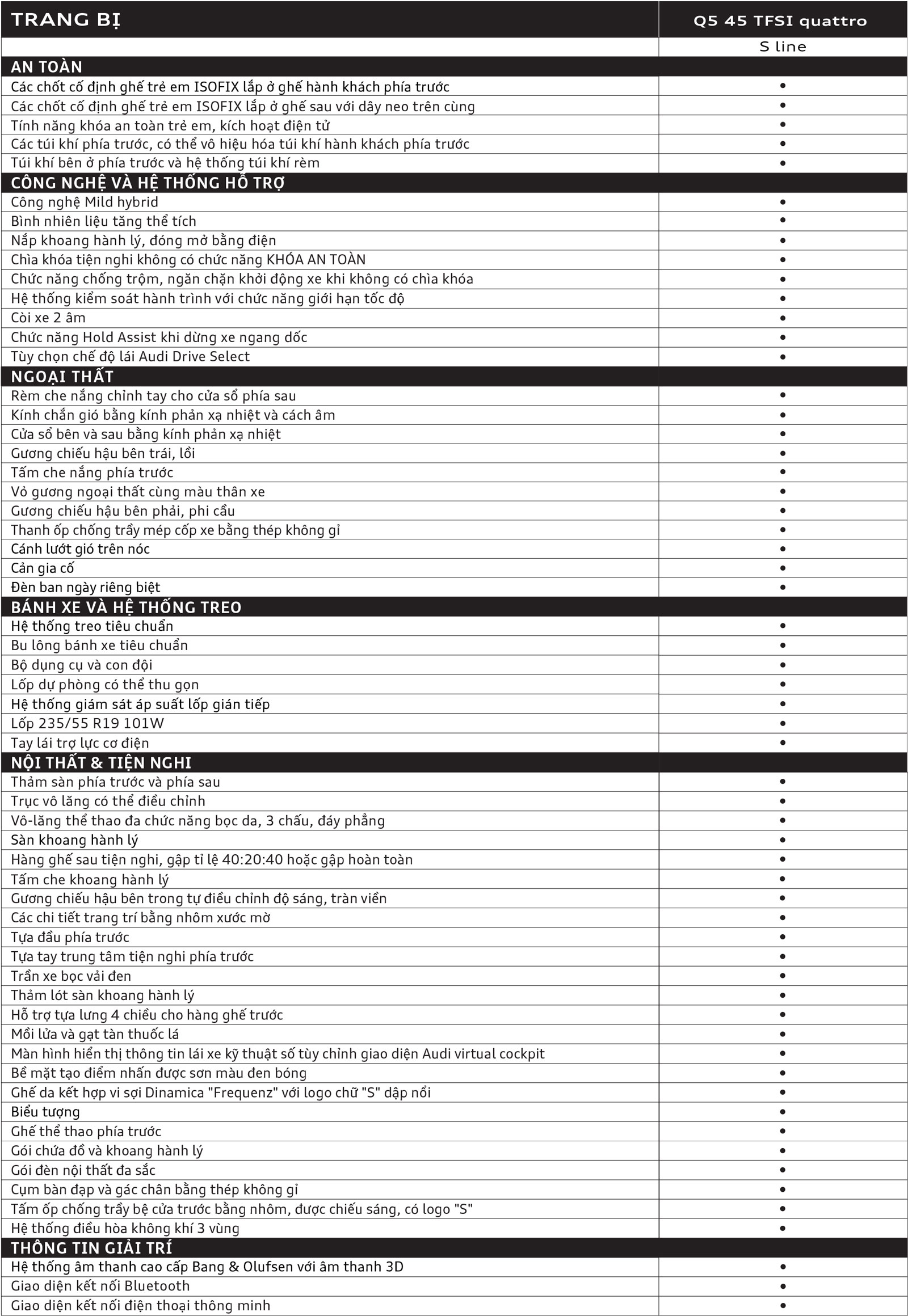 Audi Q5 45 TFSI quattro mới mang đến khả năng tăng tốc ấn tượng, vận hành năng động cùng khả năng xử lý nhạy bén. Động cơ tăng áp 2.0 lít cho công suất 245 mã lực cùng mô-men xoắn cao ở mọi dải tốc độ. Hệ thống điện Mild Hybrid (MHEV) tối ưu khả năng tiết kiệm nhiên liệu. Nó được trang bị tiên chuẩn cùng hệ thống quattro với khả năng thích ứng linh hoạt. Điều này cho phép việc phân phối lực truyền động giữa các bánh xe riêng lẻ trong những tình huống cần thiết. Bên cạnh đó, hệ thống lái Audi “drive select” cho phép bạn điều chỉnh các đặc tính của xe thông qua nhiều chế độ lái khác nhau.